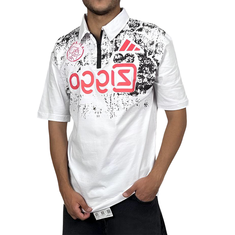 ناموجودتیشرت آستین کوتانه مردانه سفید یقه دار با طرح گرافیکی صورتی