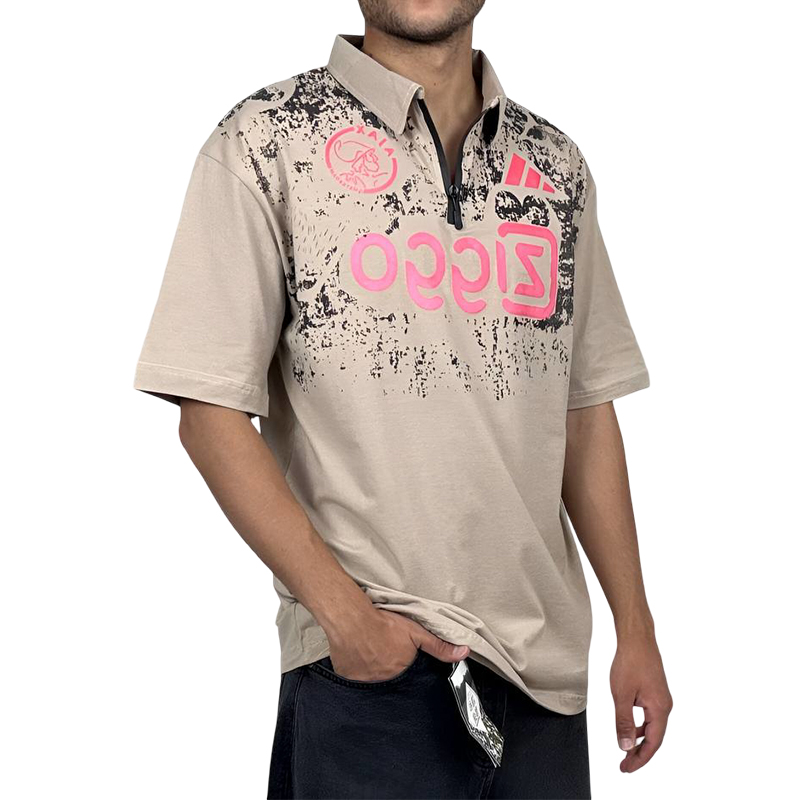 ناموجودتیشرت آستین کوتانه مردانه کرمی یقه دار با طرح گرافیکی صورتی