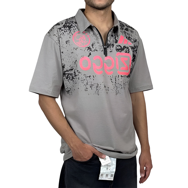 ناموجودتیشرت آستین کوتانه مردانه طوسی یقه دار با طرح گرافیکی صورتی