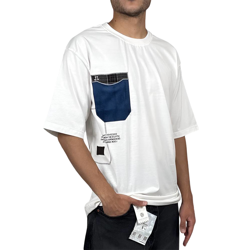 ناموجودتیشرت آستین کوتاه مردانه سفید با جیب سورمه ای طرح دار