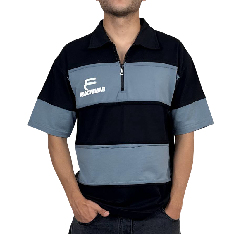 ناموجودتیشرت آستین کوتاه مردانه راه راه مشکی و طوسی با زیپ یقه