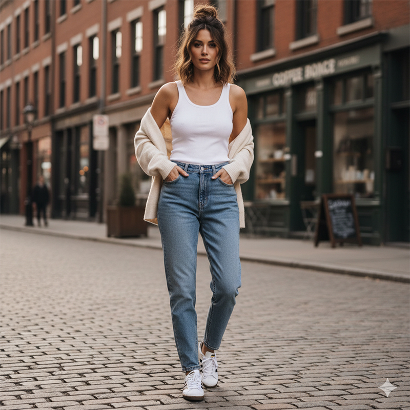 با شلوار مام فیت: این شلوارها به راحتی با لباسهای کژوال مانند تیشرتهای ساده، هودی و سویشرت ست میشوند. برای کفش، میتوانید از کتانیهای کلاسیک، اسنیکرز یا بوت استفاده کنید.