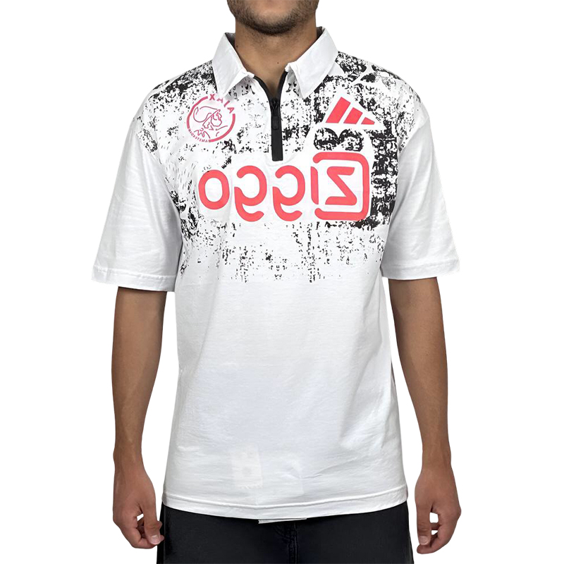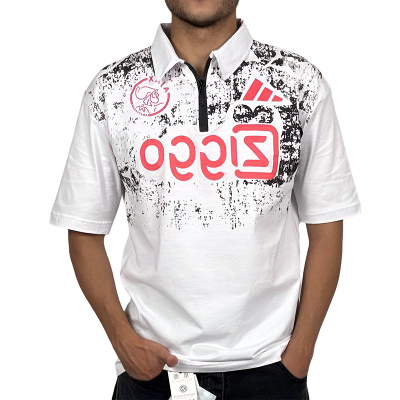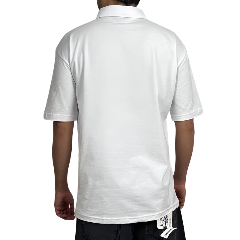 تیشرت آستین کوتانه مردانه سفید یقه دار با طرح گرافیکی صورتی